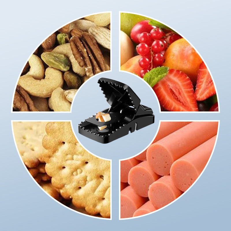 - Préparez l'appât — Utilisez du pain avec pâte d'arachide, du poisson séché, du fromage ou de la viande. Placez l'appât sur la pédale métallique. ⚠️ Important : L'appât ne doit JAMAIS dépasser la hauteur de la pédale, sinon le rat pourra manger sans déclencher le piège !
